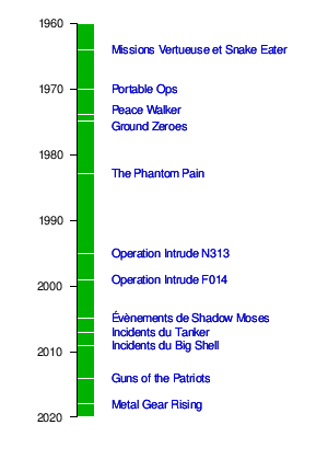 La saga Metal Gear a une sacrée chronologie! On y voit comment les différents membres de la famille Snake doivent faire face aux plus grands conflits de notre histoire.