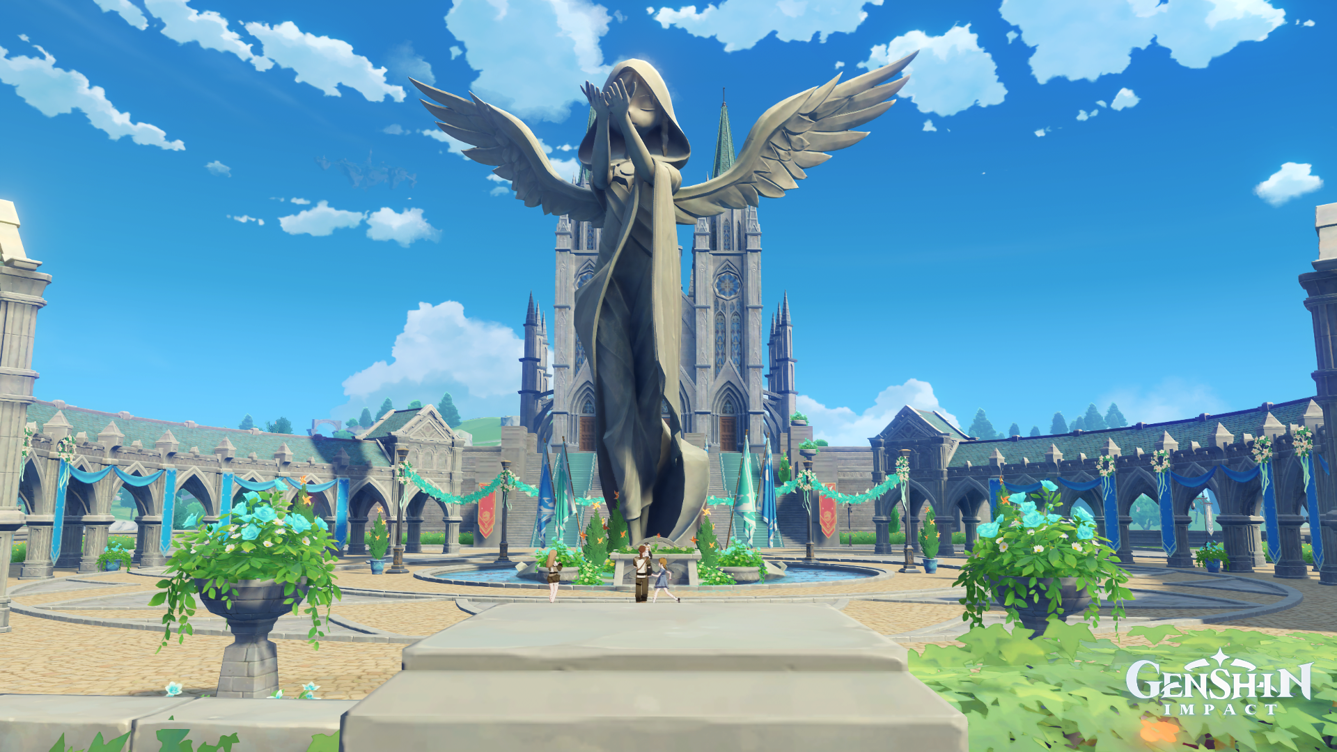 Lorsque Rosalyne arriva devant la ville, elle se fit la réflexion que malgré les imposantes murailles entourant la cité, celle-ci semblait s’élancer vers le ciel, comme une ôde à la liberté. Ce n’était pas la cité de Barbatos, Archon de l’élément Anemo, sans raison. La jeune femme était assez impressionnée par l’enchevêtrement à la fois simple et complexe des maisons qui ceignaient les rues.